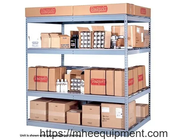 Rugged, sturdy and safe storage. Beams adjust on 1 1/2″ centers. All components are 14 ga. Beams easily snap into posts as shown. Post and beams are Gray polyester finish. All units priced with 4 levels. Other decking is also available from any lumberyard or home center. Unit is shown with galvanized steel decking. FOB Shipping Point.